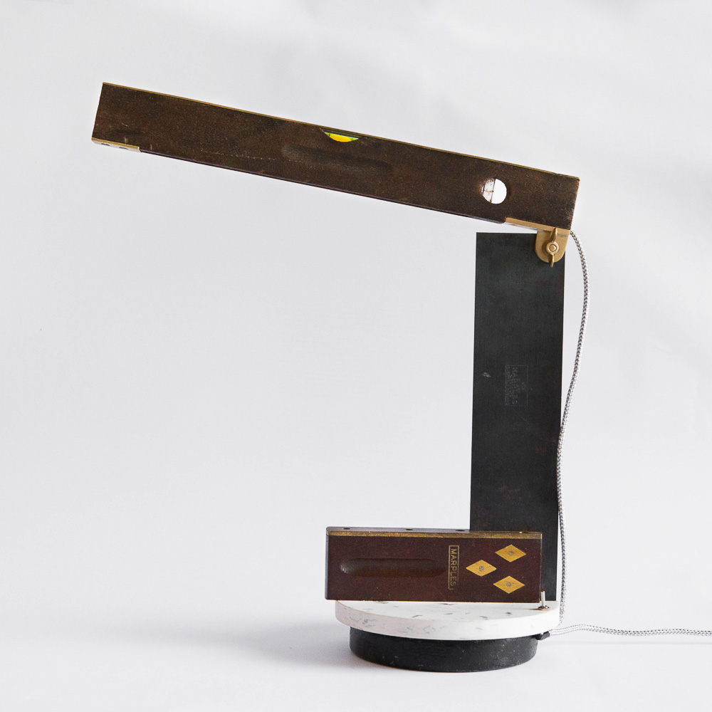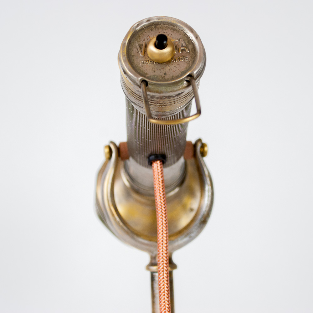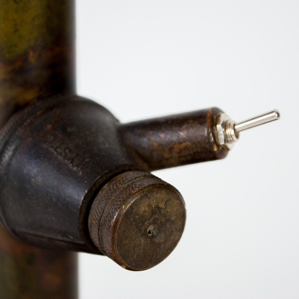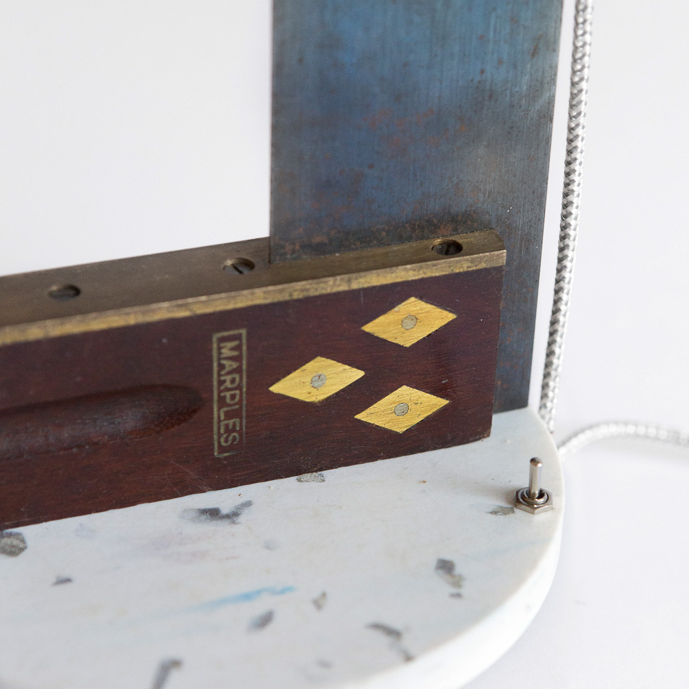 A block that's lost its scribe, replaced with a new steel upright and copper spinning. Switch mounted in a slice of brass.