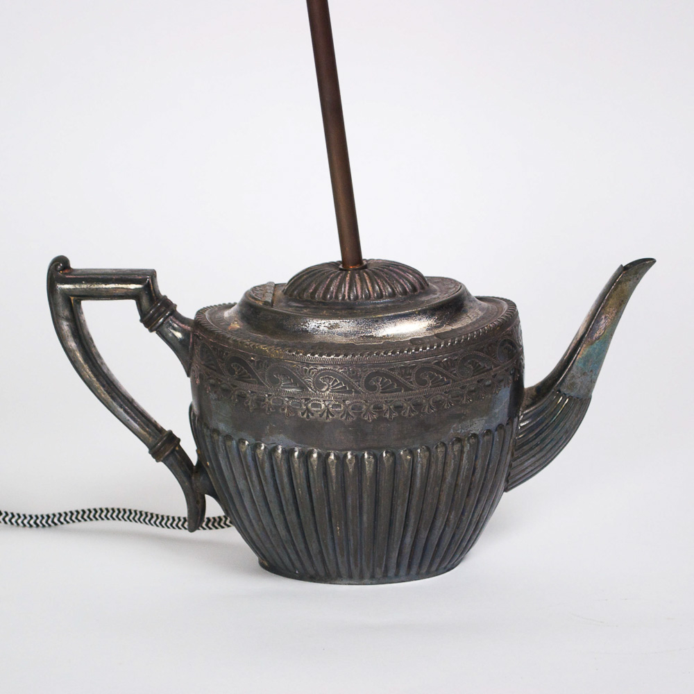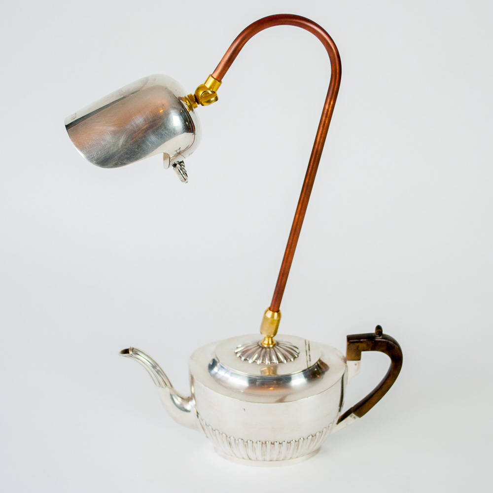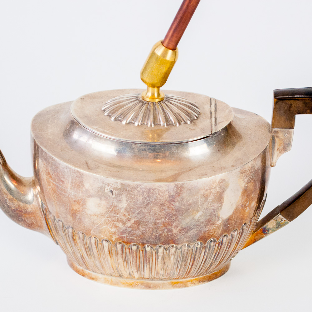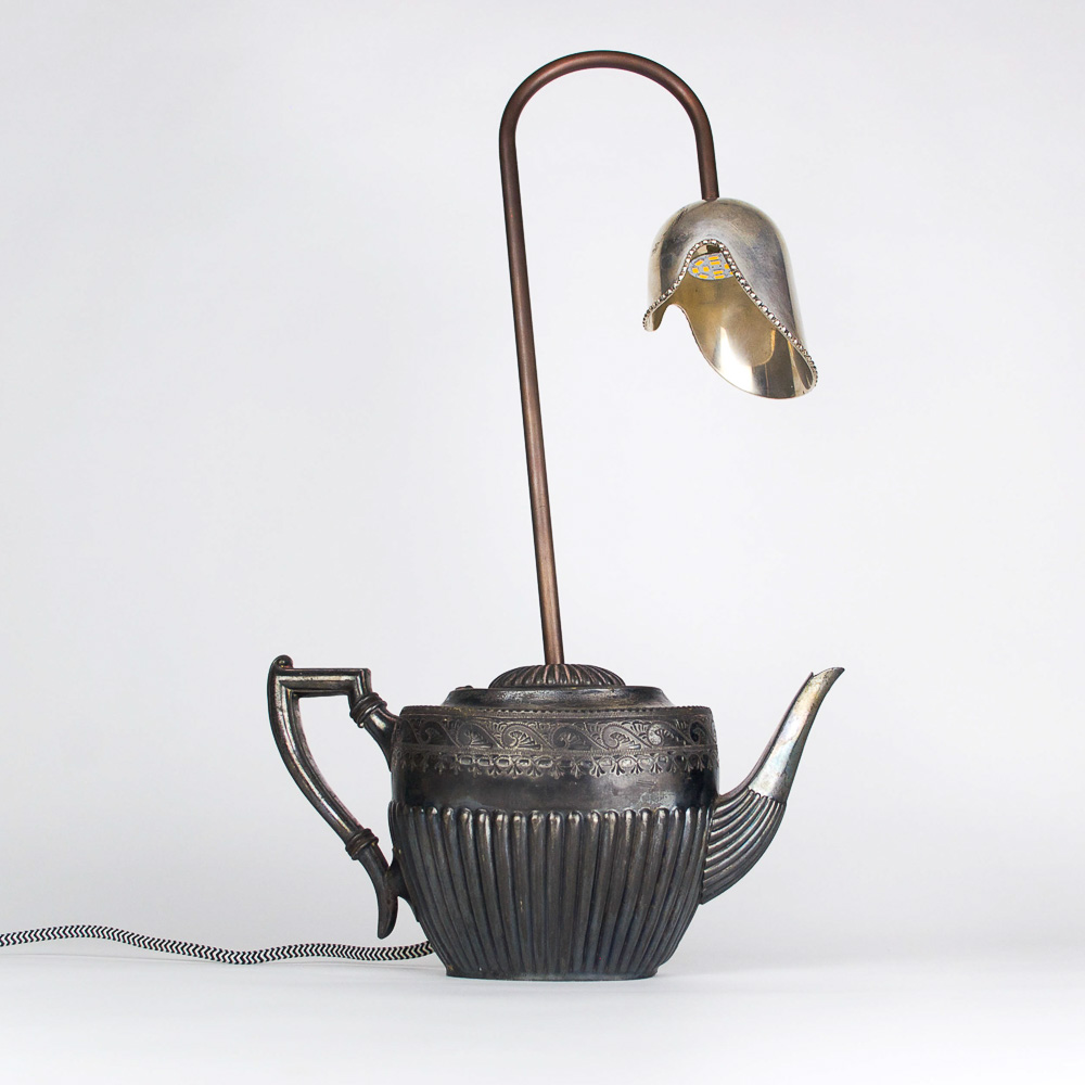 Abandoned teapot, copper stem and a waylaid sugar scoop.