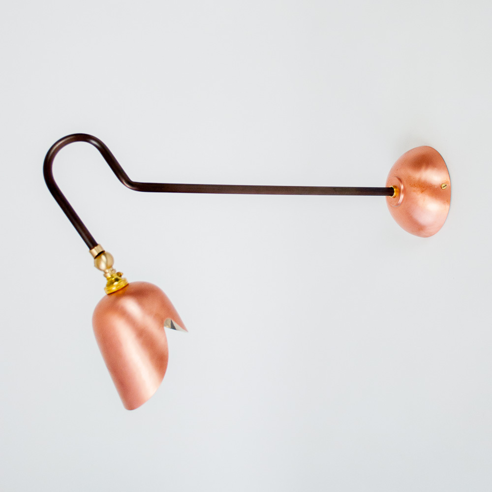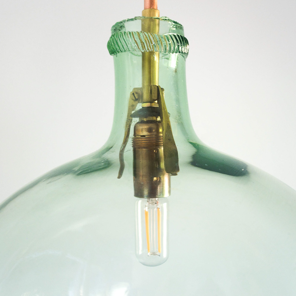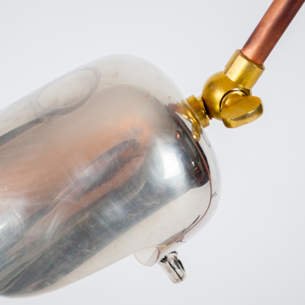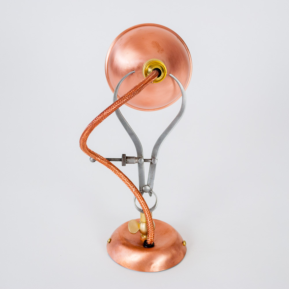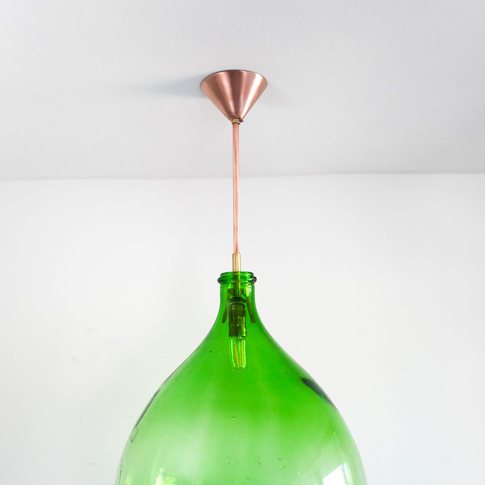 A swirl of copper tube suspending a vintage glass funnel, topped off with a copper jelly mould ceiling cut.
