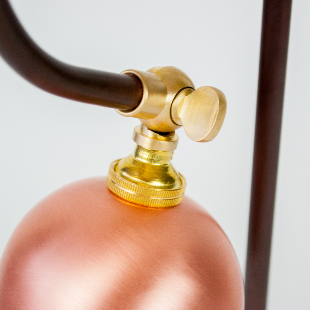 The original inspiration for this lamp was a violin bow sliding on the wooden wheel. Through prototyping its morphed into this elegant beauty. Tulip wood base with a ye old penny switch, brass stem and bow tensioned over a discarded wooden wheel with an out of tune piano wire. A copper spinning for a shade and an out of date weight to counter balance it.