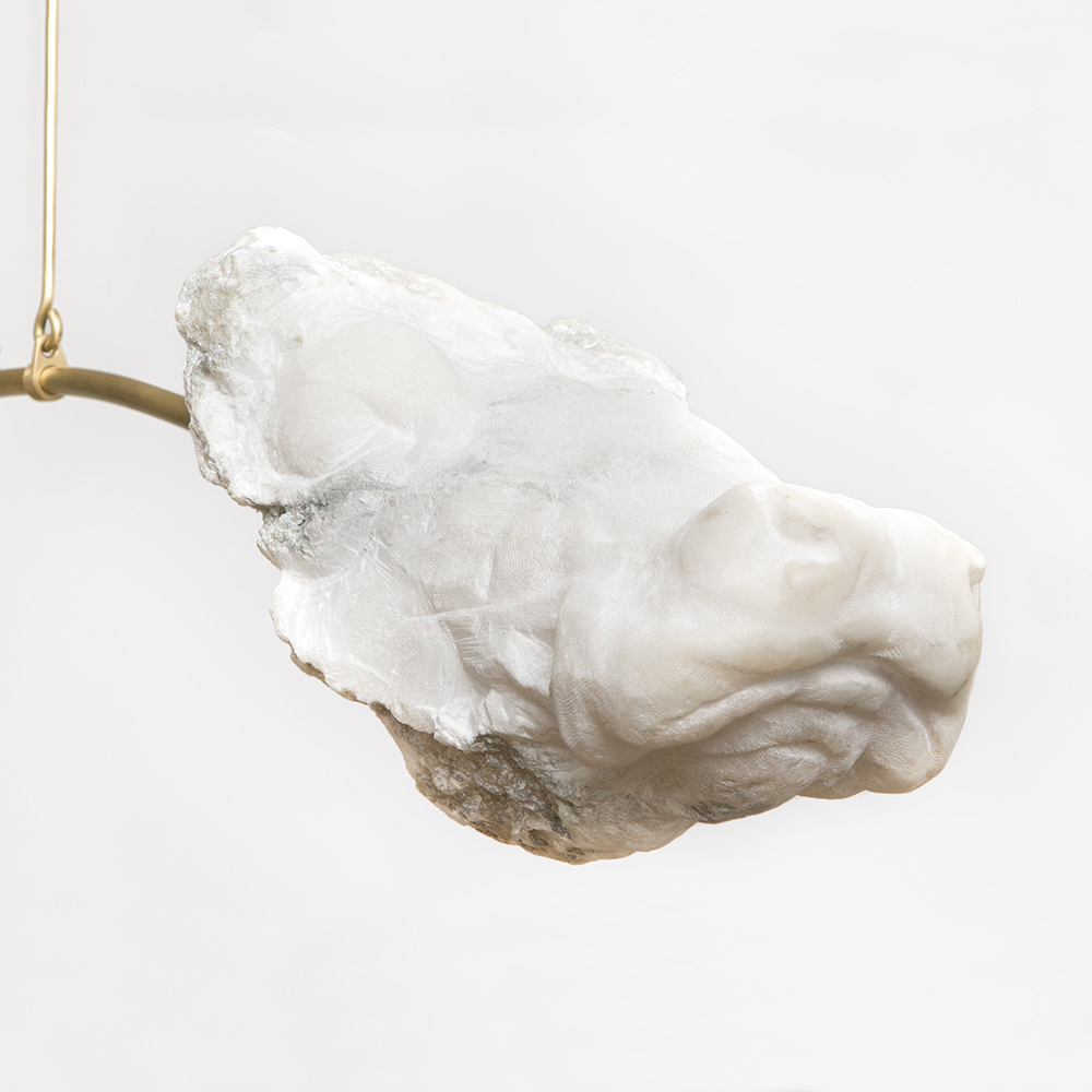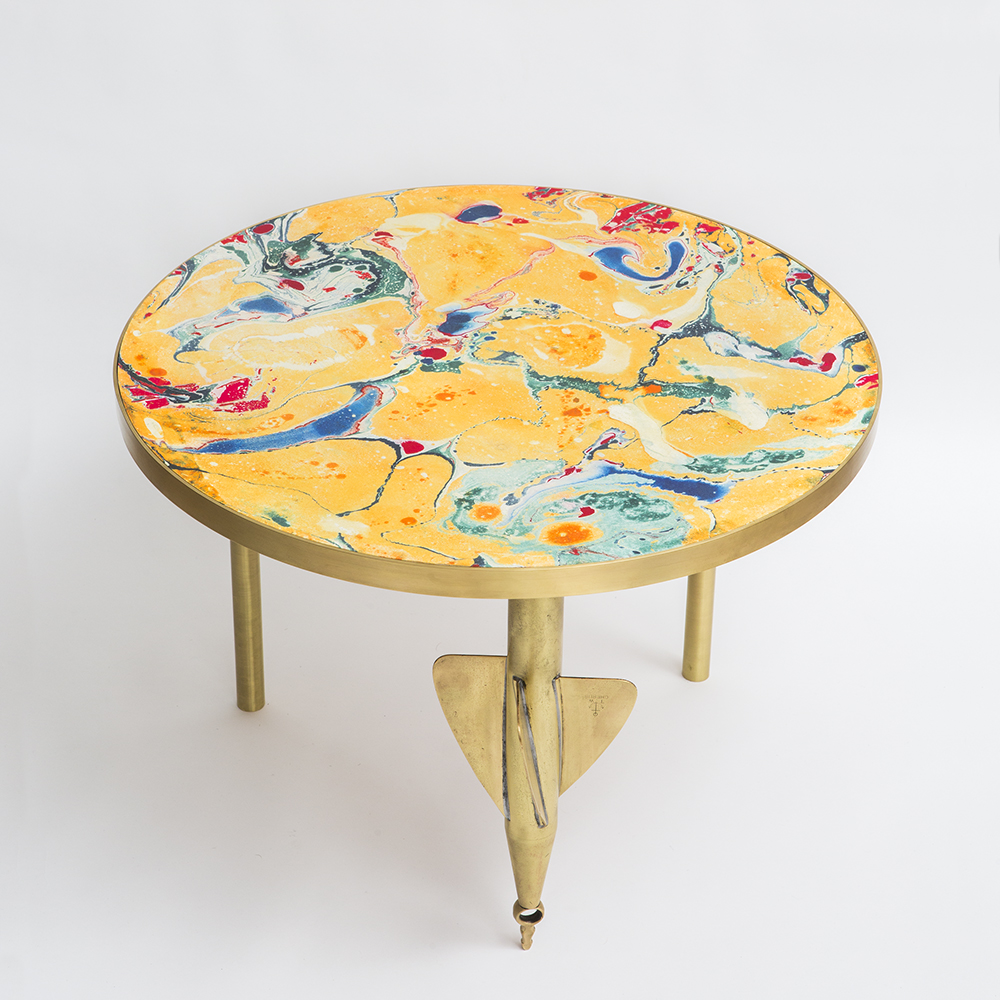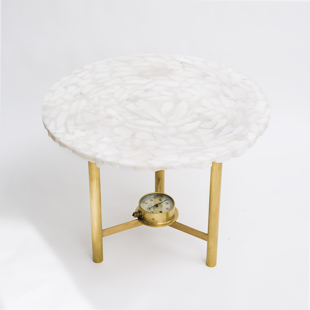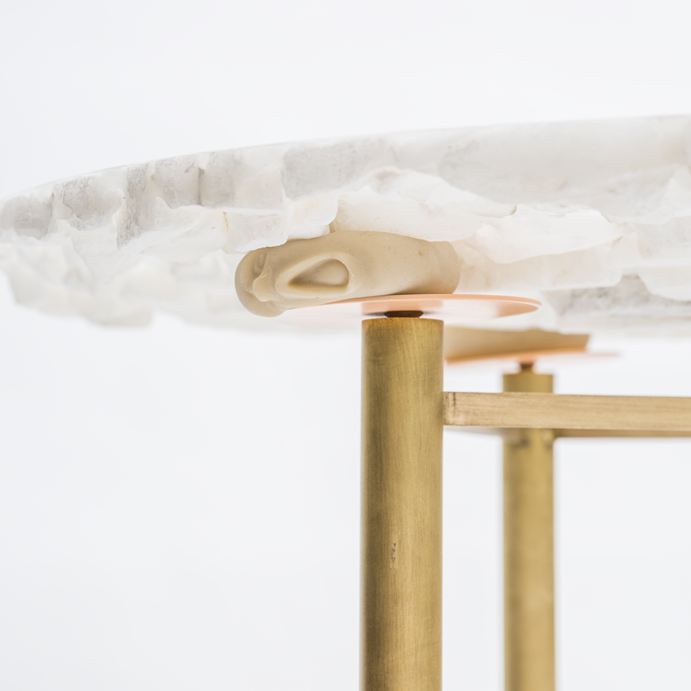 The table is made from English alabaster chipping salvaged from previous carvings held in a pool of resin. The underside is left rough and craggy while the top is perfectly smooth. The top rests on three case rubber heads, gently being squashed onto a base of brushed brass, whilst an old pressure gauge secures the centre of the legs. These rubber heads give the table top a gentle and comedic wobble - 48cm h x 60cm d.