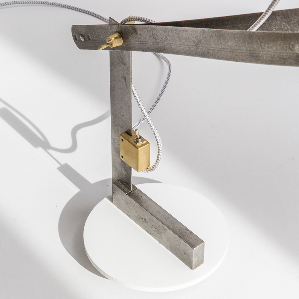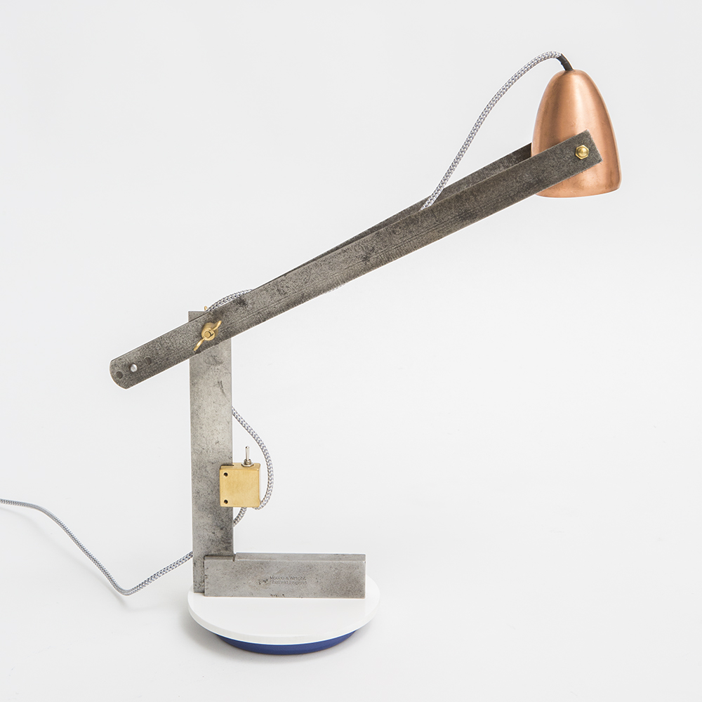 Dumbbell weight, a disc of recycled acrylic sheet secured to a carpenters square, supporting two steel rules clasping a spun copper shade-30cm h x 32cm dx 10cm w.