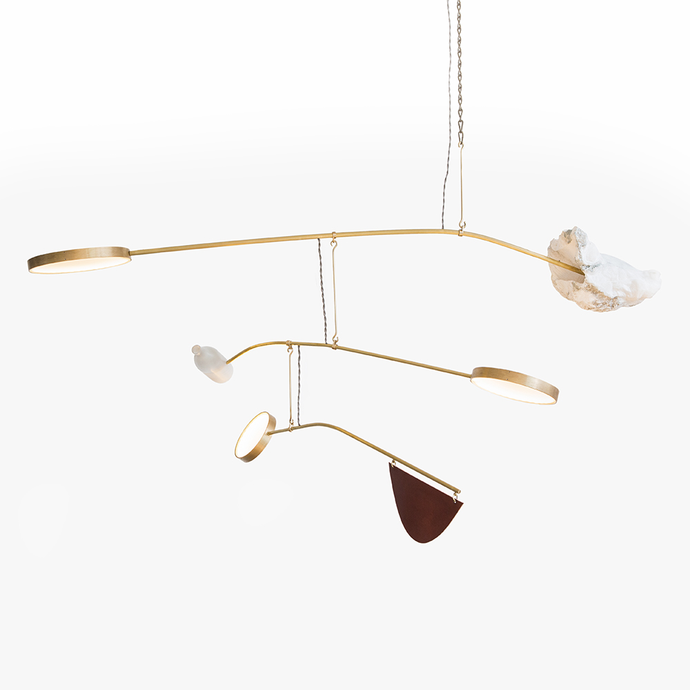 This piece is a kinetic chandelier based on the nursery rhyme “Hey diddle diddle”, and an homage to our late co-founder. It contains a hand-carved cows head in English Alabaster, a cast milk bottle (resin and onyx powder) and a fin of book binding leather in the 2D form of a jump. Each of the three items is held in perfect balance by a series of brass rods, each of which also holds a moon for the cow to jump over. We wanted to crate a mobile chandelier. Previous pieces had led us down a lunar path and so someone jokingly said, “I know, how about The Cow that Jumped Over the Moon.” What started as a joke gradually became a discussion and finally a design - 180cm w x 50cm d x 70cm h.