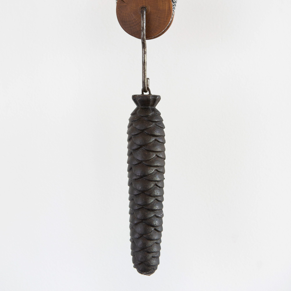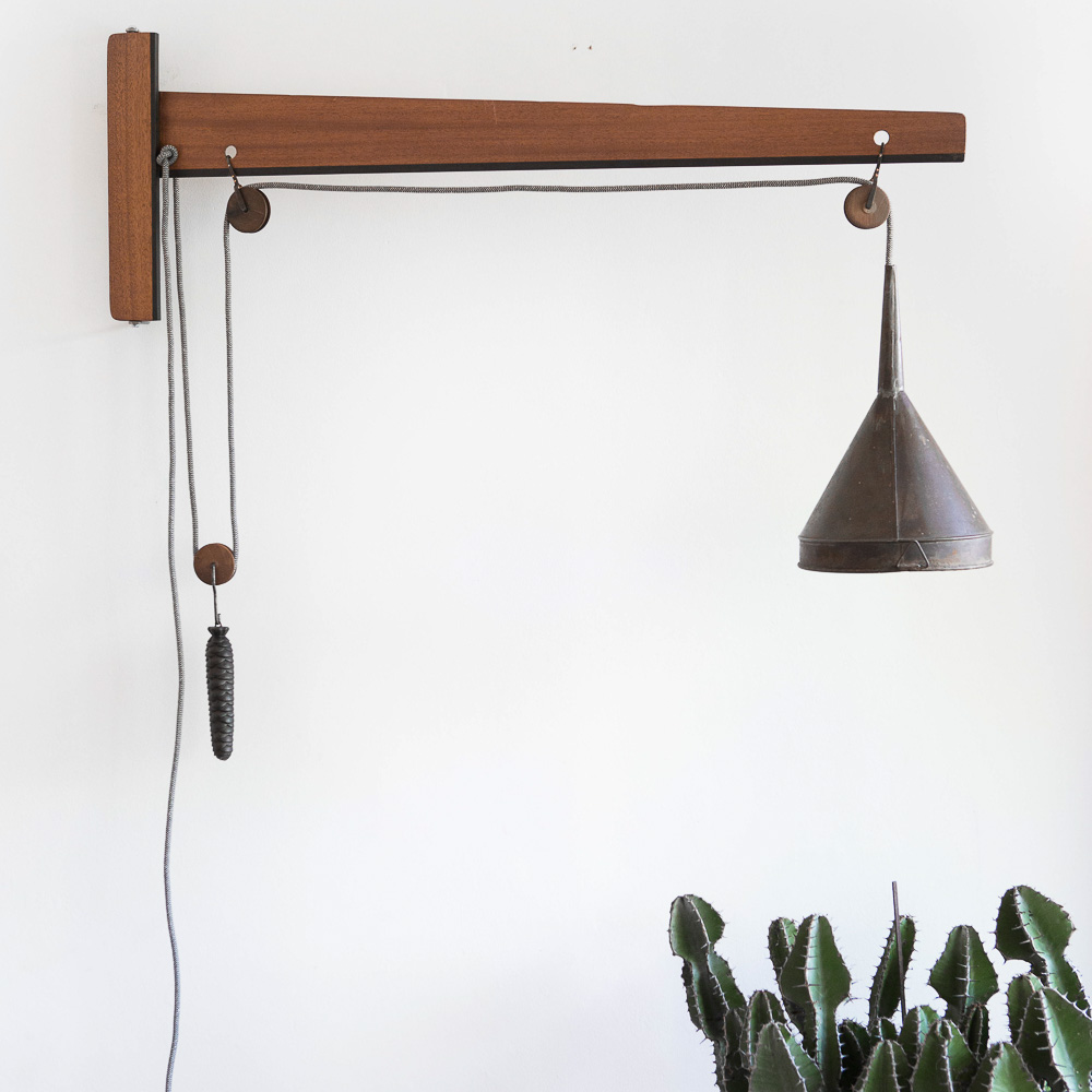 Old garage funnel countered over wooden pulley wheels with an escaped cuckoo clock weight, suspended from an old school wooden square.