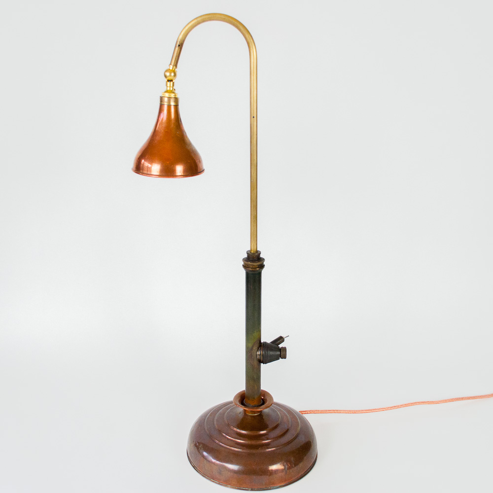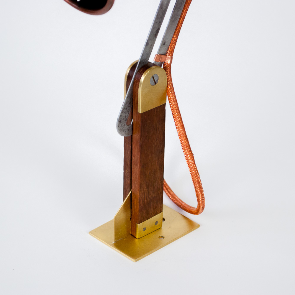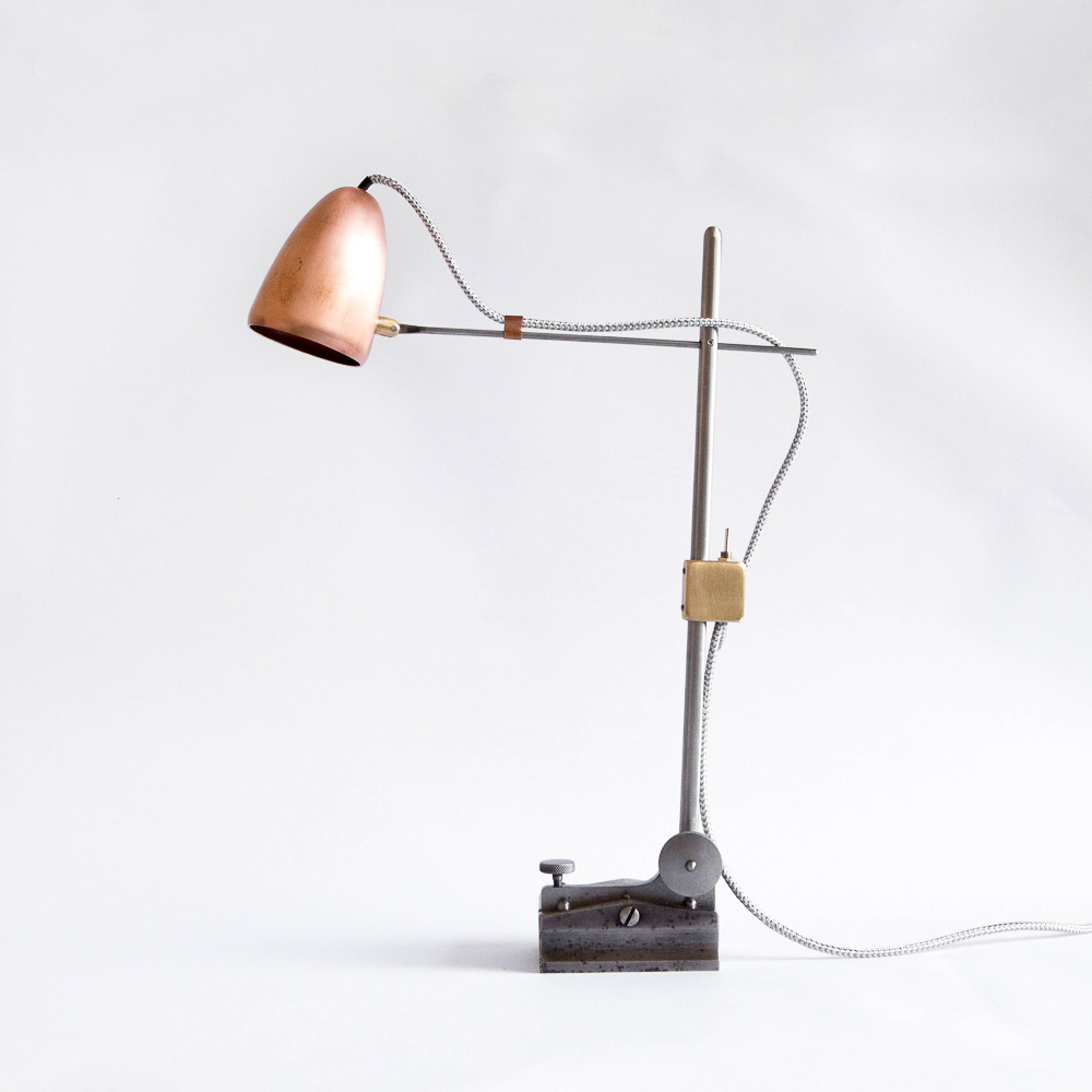 A block that's lost its scribe, replaced with a new steel upright and copper spinning. Switch mounted in a slice of brass.