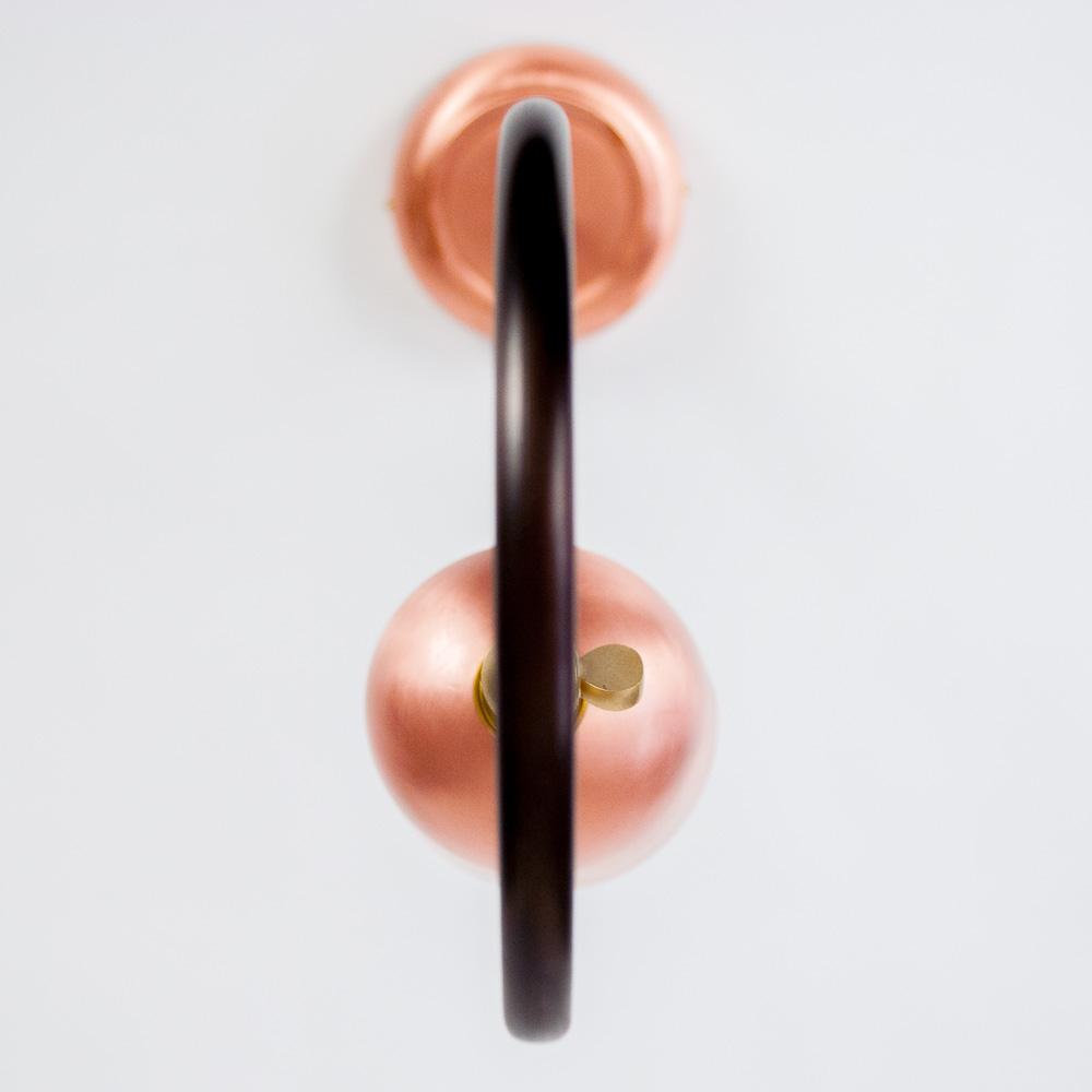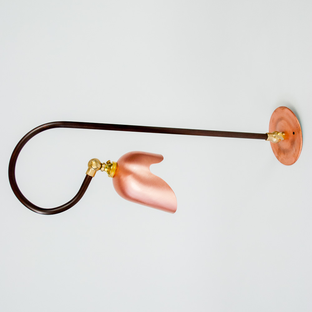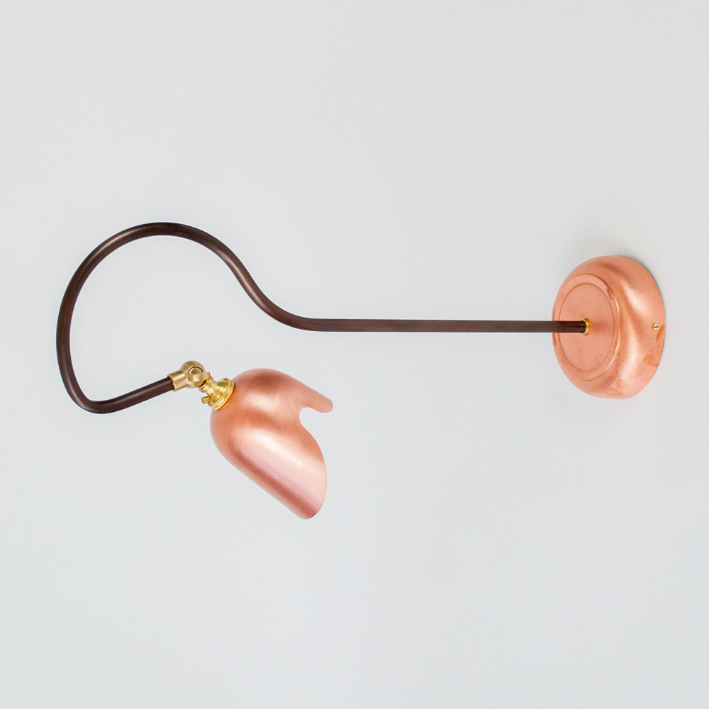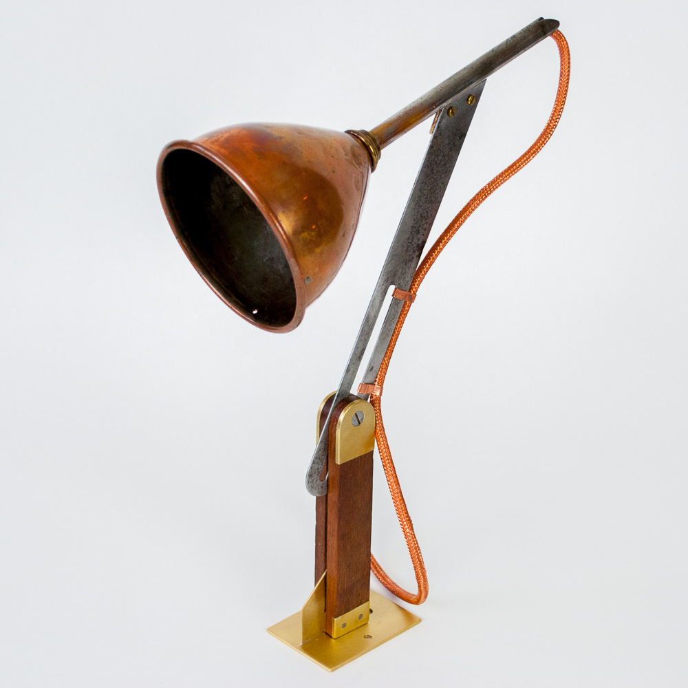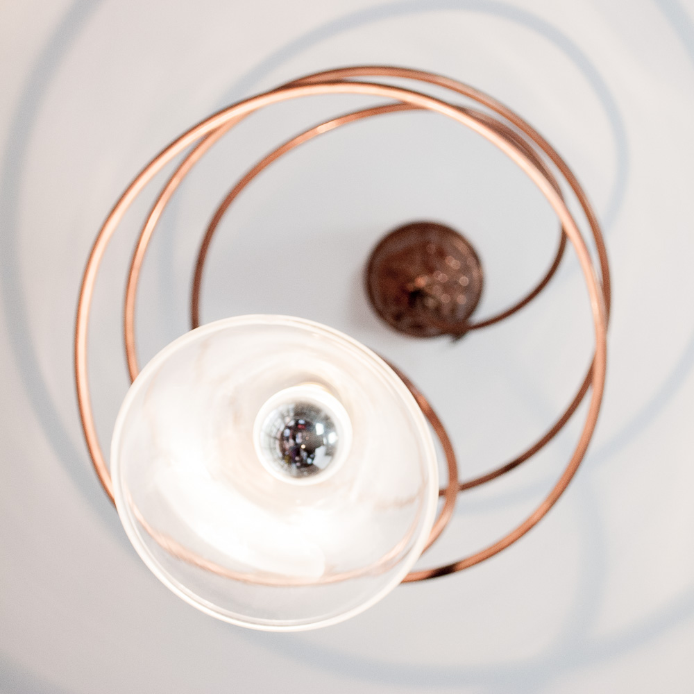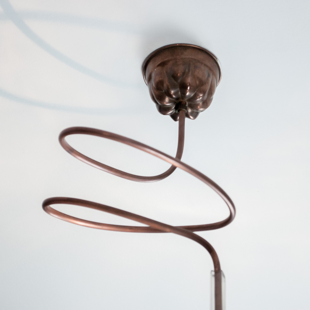 A swirl of copper tube suspending a vintage glass funnel, topped off with a copper jelly mould ceiling cut.