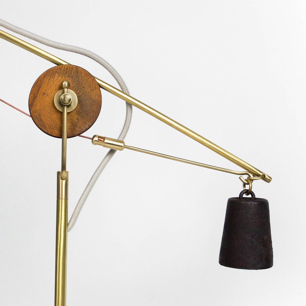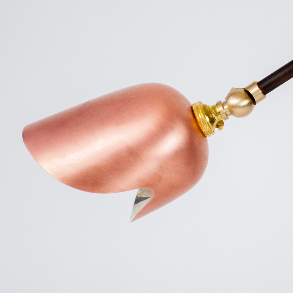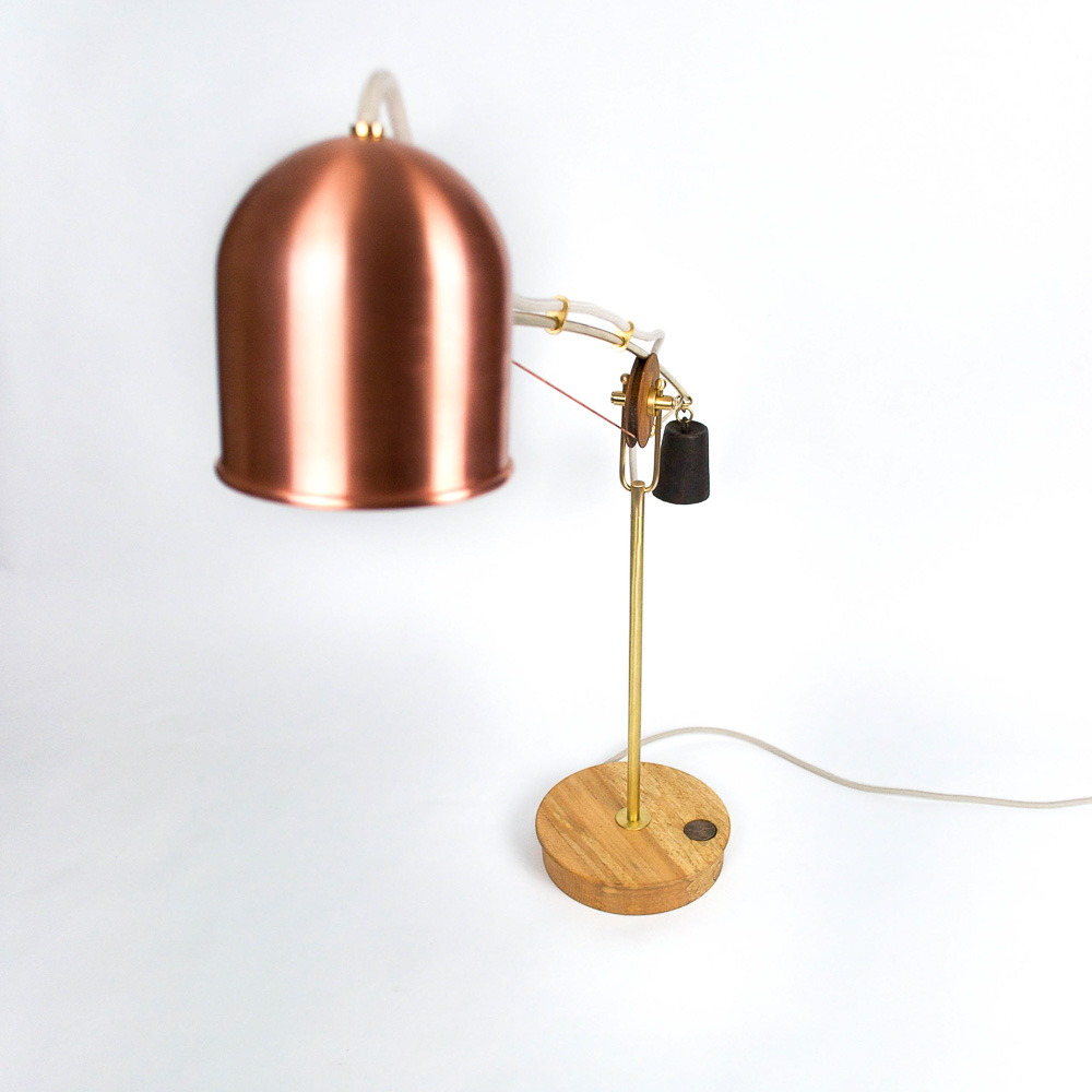 The original inspiration for this lamp was a violin bow sliding on the wooden wheel. Through prototyping its morphed into this elegant beauty. Tulip wood base with a ye old penny switch, brass stem and bow tensioned over a discarded wooden wheel with an out of tune piano wire. A copper spinning for a shade and an out of date weight to counter balance it.