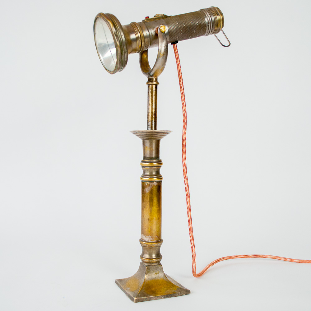 Pre-loved torch recruited while in Italy, a candle stick and a rolock that's lost its rowing boat.