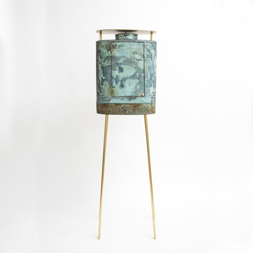 This deliciously patinated copper tank is all natural - we have only added adjustable legs, a top and cut a door into it with a tiny pink knob. These tanks were originally manufactured and used for spraying the grape vines in France. We have about fifteen in stock, all slightly different styles with vastly varying degrees of verdigris. The legs can be made to any size and have adjustable ends to accommodate uneven floors-110cm h x 37cm w x 20cm d.