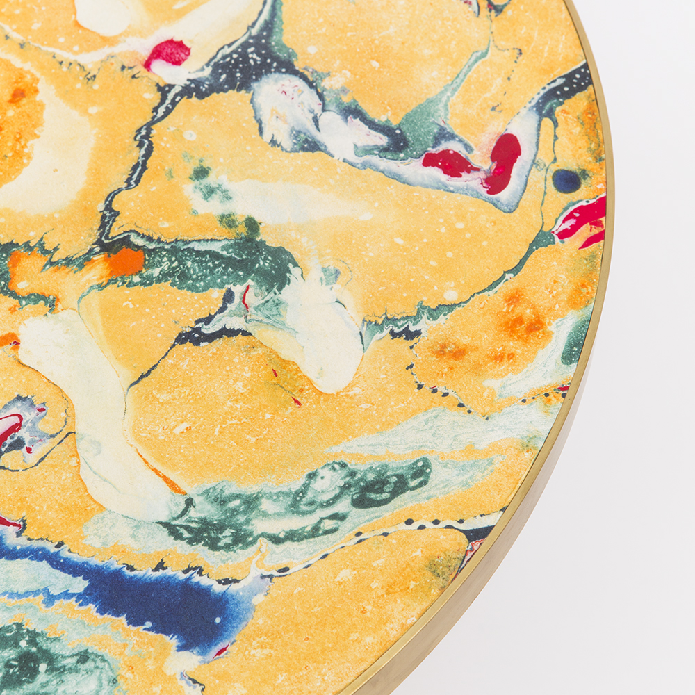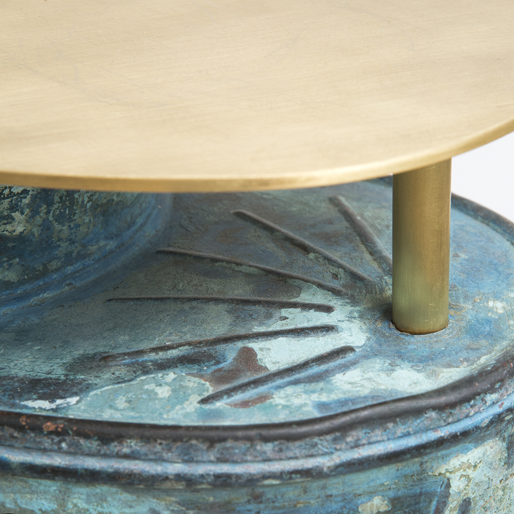 The table is made from English alabaster chipping salvaged from previous carvings held in a pool of resin. The underside is left rough and craggy while the top is perfectly smooth. The top rests on three case rubber heads, gently being squashed onto a base of brushed brass, whilst an old pressure gauge secures the centre of the legs. These rubber heads give the table top a gentle and comedic wobble - 48cm h x 60cm d.